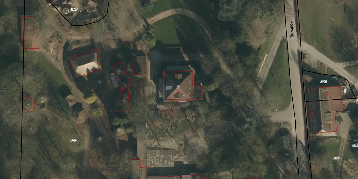 Het perceel waarop Postweg 6 staat heeft een oppervlakte van 4,3 ha. Dit is een zeer groot perceel. De perceeloppervlakte wordt geregistreerd door het Kadaster. Gedetailleerde informatie over de maten van dit perceel kunt u vinden in het rapport Kadastrale kaart met maatvoering van Postweg 6.