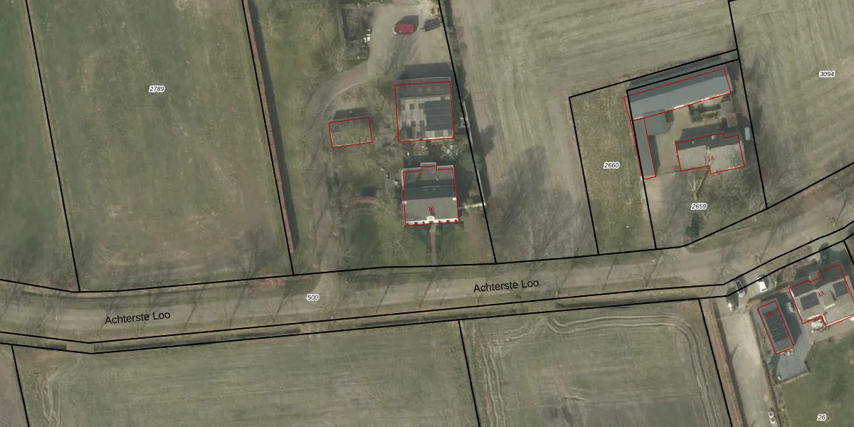 Het perceel waarop Achterste Loo 16 staat heeft een oppervlakte van 1,1 ha. Dit is een zeer groot perceel. De perceeloppervlakte wordt geregistreerd door het Kadaster. Gedetailleerde informatie over de maten van dit perceel kunt u vinden in het rapport Kadastrale kaart met maatvoering van Achterste Loo 16.
