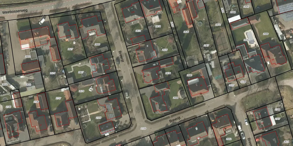 Het perceel waarop Breerijt 40 staat heeft een oppervlakte van 491 m². Dit is een groot perceel. De perceeloppervlakte wordt geregistreerd door het Kadaster. Gedetailleerde informatie over de maten van dit perceel kunt u vinden in het rapport Kadastrale kaart met maatvoering van Breerijt 40.