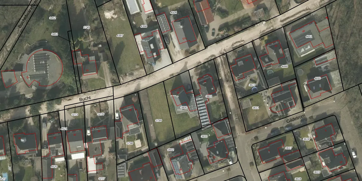 Het perceel waarop Bucht 40 staat heeft een oppervlakte van 499 m². Dit is een groot perceel. De perceeloppervlakte wordt geregistreerd door het Kadaster. Gedetailleerde informatie over de maten van dit perceel kunt u vinden in het rapport Kadastrale kaart met maatvoering van Bucht 40.