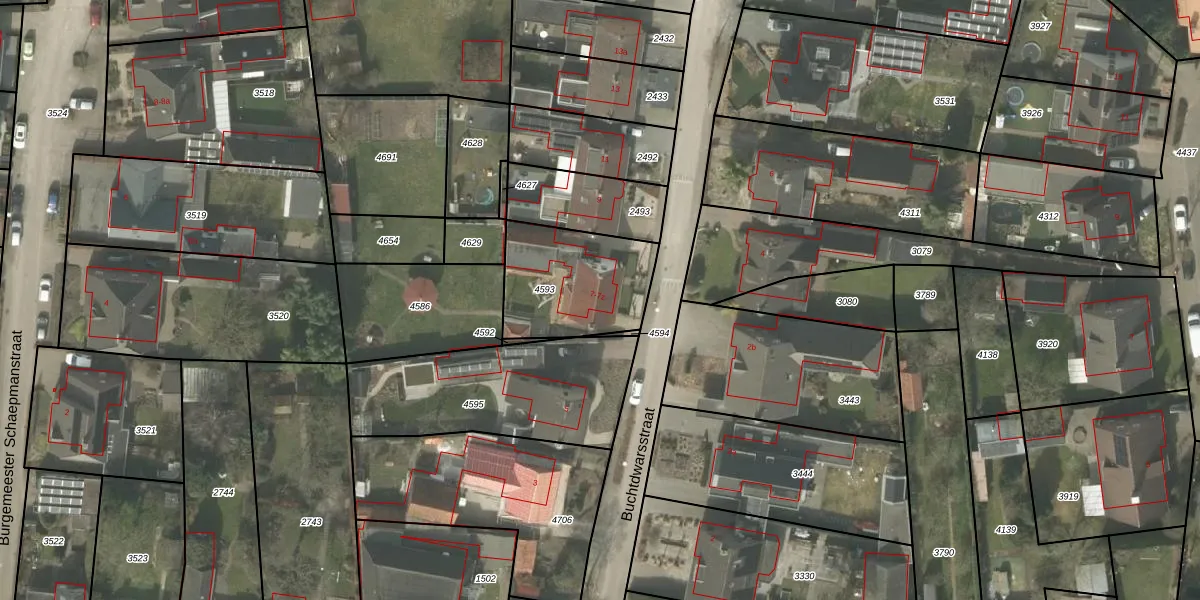 Buchtdwarsstraat 7 is gelegen op kadastraal perceel BEK00B4593. Deze kadastrale aanduiding is uniek en wordt gebruikt door het Kadaster om eigendomsrechten en andere zakelijke rechten vast te leggen. Het perceel maakt onderdeel uit van de kadastrale gemeente Bergeijk.