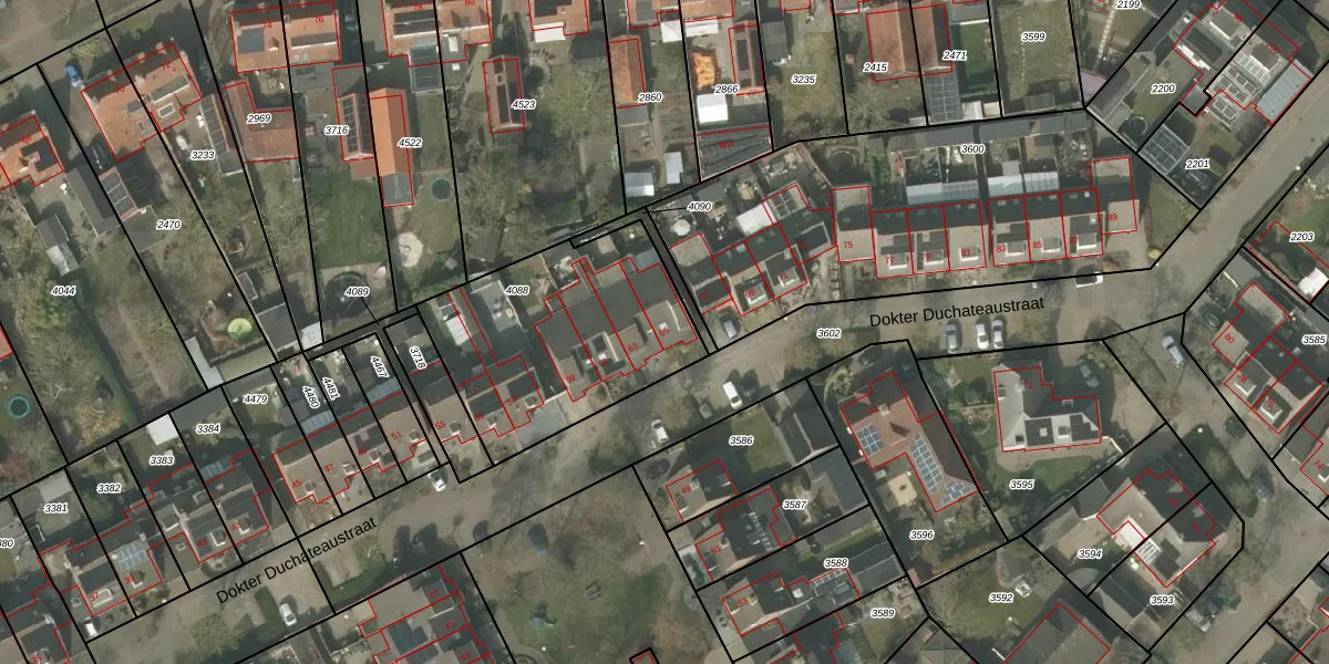 Het perceel waarop Dokter Duchateaustraat 65 staat heeft een oppervlakte van 909 m². Dit is een groot perceel. De perceeloppervlakte wordt geregistreerd door het Kadaster. Gedetailleerde informatie over de maten van dit perceel kunt u vinden in het rapport Kadastrale kaart met maatvoering van Dokter Duchateaustraat 65.