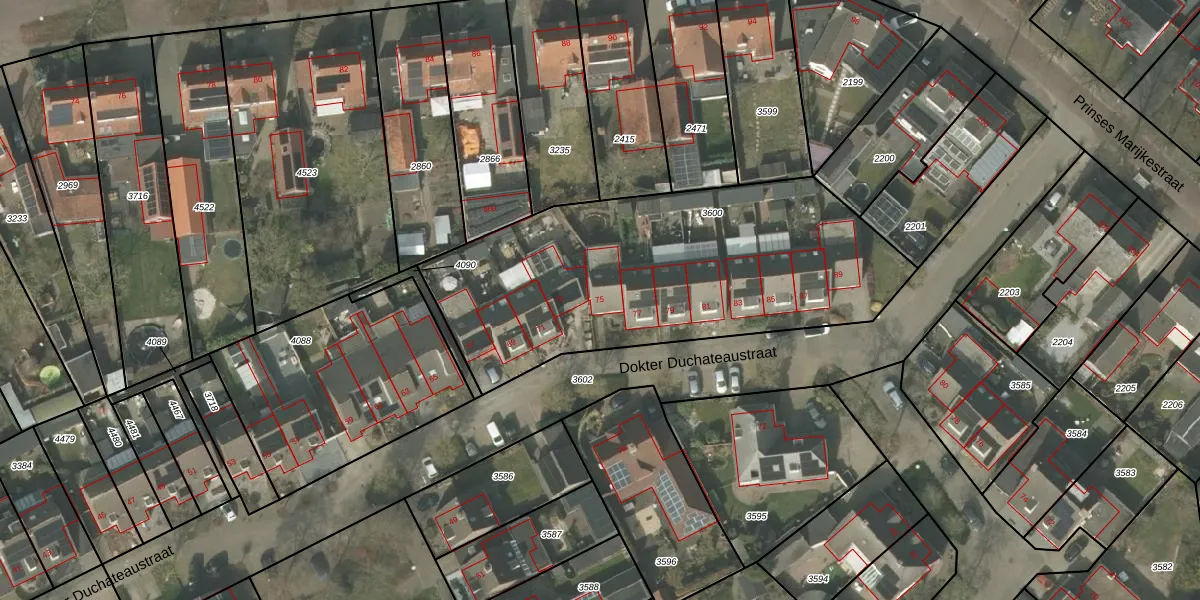 Dokter Duchateaustraat 75 is gelegen op kadastraal perceel BEK00B3600. Deze kadastrale aanduiding is uniek en wordt gebruikt door het Kadaster om eigendomsrechten en andere zakelijke rechten vast te leggen. Het perceel maakt onderdeel uit van de kadastrale gemeente Bergeijk.