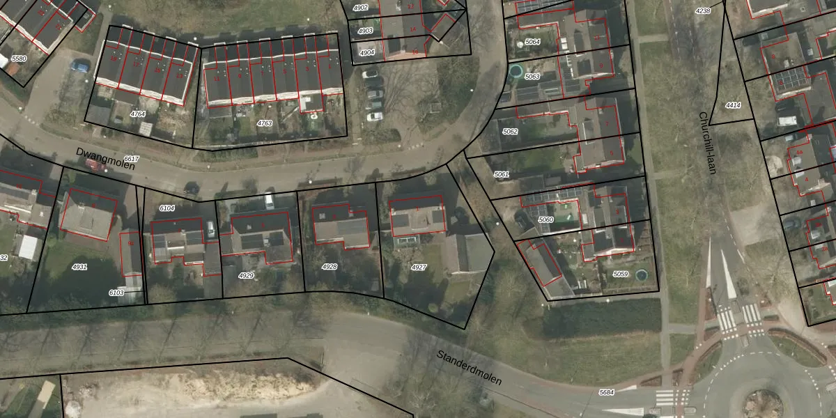 Het perceel waarop Dwangmolen 1 staat heeft een oppervlakte van 779 m². Dit is een groot perceel. De perceeloppervlakte wordt geregistreerd door het Kadaster. Gedetailleerde informatie over de maten van dit perceel kunt u vinden in het rapport Kadastrale kaart met maatvoering van Dwangmolen 1.