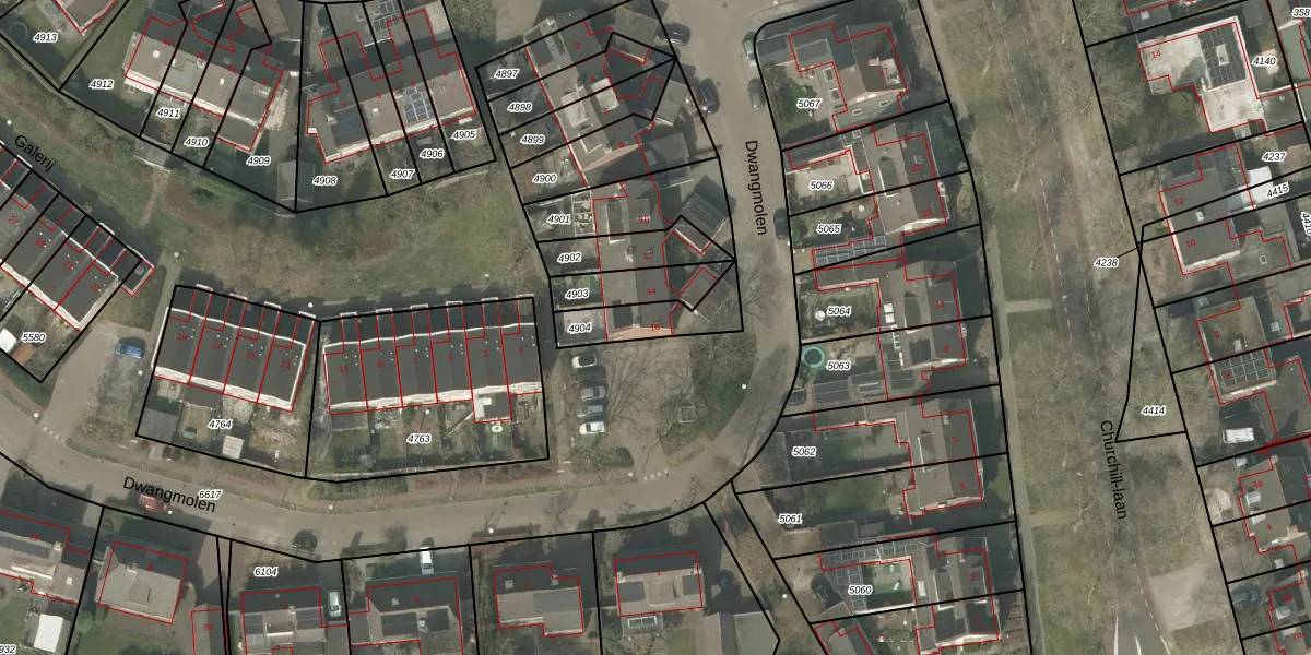 Het perceel waarop Dwangmolen 16 staat heeft een oppervlakte van 177 m². Dit is een middelgroot perceel. De perceeloppervlakte wordt geregistreerd door het Kadaster. Gedetailleerde informatie over de maten van dit perceel kunt u vinden in het rapport Kadastrale kaart met maatvoering van Dwangmolen 16.