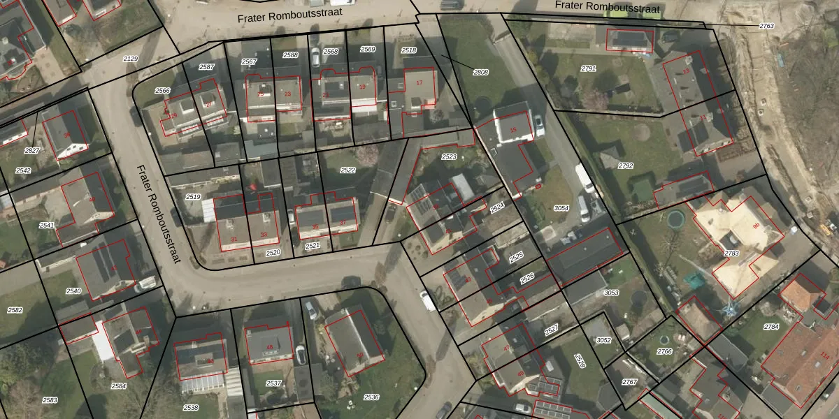 Het perceel waarop Frater Romboutsstraat 39 staat heeft een oppervlakte van 490 m². Dit is een groot perceel. De perceeloppervlakte wordt geregistreerd door het Kadaster. Gedetailleerde informatie over de maten van dit perceel kunt u vinden in het rapport Kadastrale kaart met maatvoering van Frater Romboutsstraat 39.
