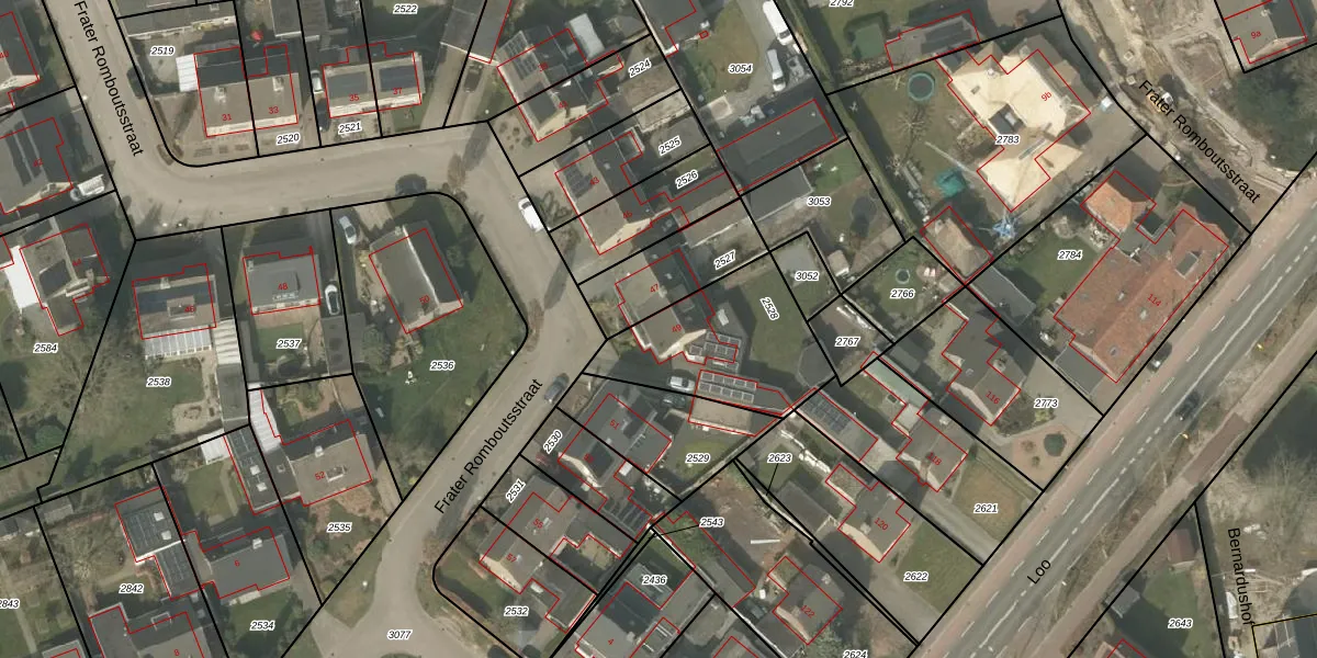 Het perceel waarop Frater Romboutsstraat 49 staat heeft een oppervlakte van 515 m². Dit is een groot perceel. De perceeloppervlakte wordt geregistreerd door het Kadaster. Gedetailleerde informatie over de maten van dit perceel kunt u vinden in het rapport Kadastrale kaart met maatvoering van Frater Romboutsstraat 49.