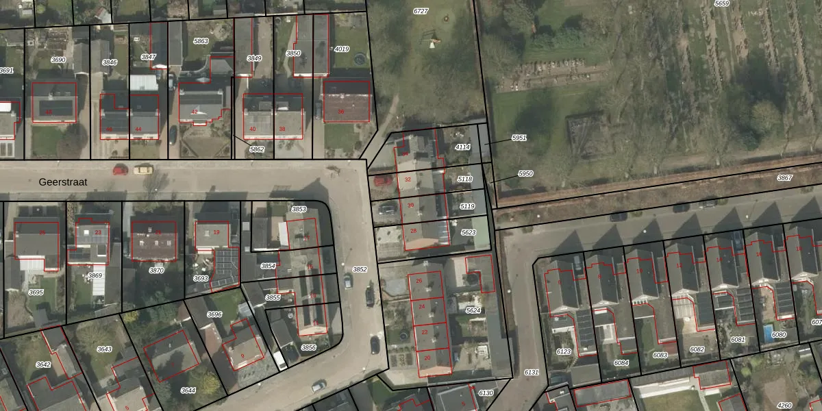 Het perceel waarop Geerstraat 30 staat heeft een oppervlakte van 171 m². Dit is een middelgroot perceel. De perceeloppervlakte wordt geregistreerd door het Kadaster. Gedetailleerde informatie over de maten van dit perceel kunt u vinden in het rapport Kadastrale kaart met maatvoering van Geerstraat 30.