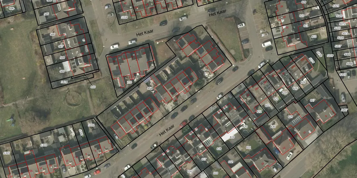Het perceel waarop Het Kaar 17 staat heeft een oppervlakte van 1976 m². Dit is een zeer groot perceel. De perceeloppervlakte wordt geregistreerd door het Kadaster. Gedetailleerde informatie over de maten van dit perceel kunt u vinden in het rapport Kadastrale kaart met maatvoering van Het Kaar 17.