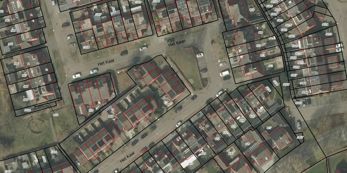 Het perceel waarop Het Kaar 25 staat heeft een oppervlakte van 1976 m². Dit is een zeer groot perceel. De perceeloppervlakte wordt geregistreerd door het Kadaster. Gedetailleerde informatie over de maten van dit perceel kunt u vinden in het rapport Kadastrale kaart met maatvoering van Het Kaar 25.