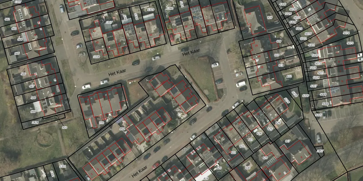 Het perceel waarop Het Kaar 27 staat heeft een oppervlakte van 1976 m². Dit is een zeer groot perceel. De perceeloppervlakte wordt geregistreerd door het Kadaster. Gedetailleerde informatie over de maten van dit perceel kunt u vinden in het rapport Kadastrale kaart met maatvoering van Het Kaar 27.