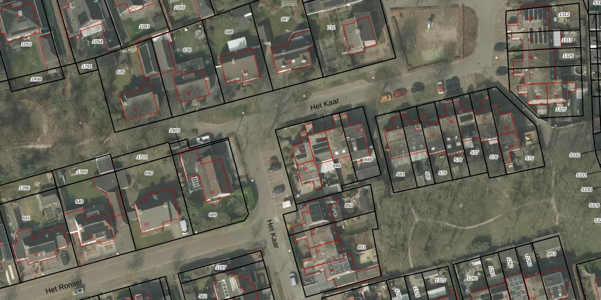 Het perceel waarop Het Kaar 66 staat heeft een oppervlakte van 534 m². Dit is een groot perceel. De perceeloppervlakte wordt geregistreerd door het Kadaster. Gedetailleerde informatie over de maten van dit perceel kunt u vinden in het rapport Kadastrale kaart met maatvoering van Het Kaar 66.