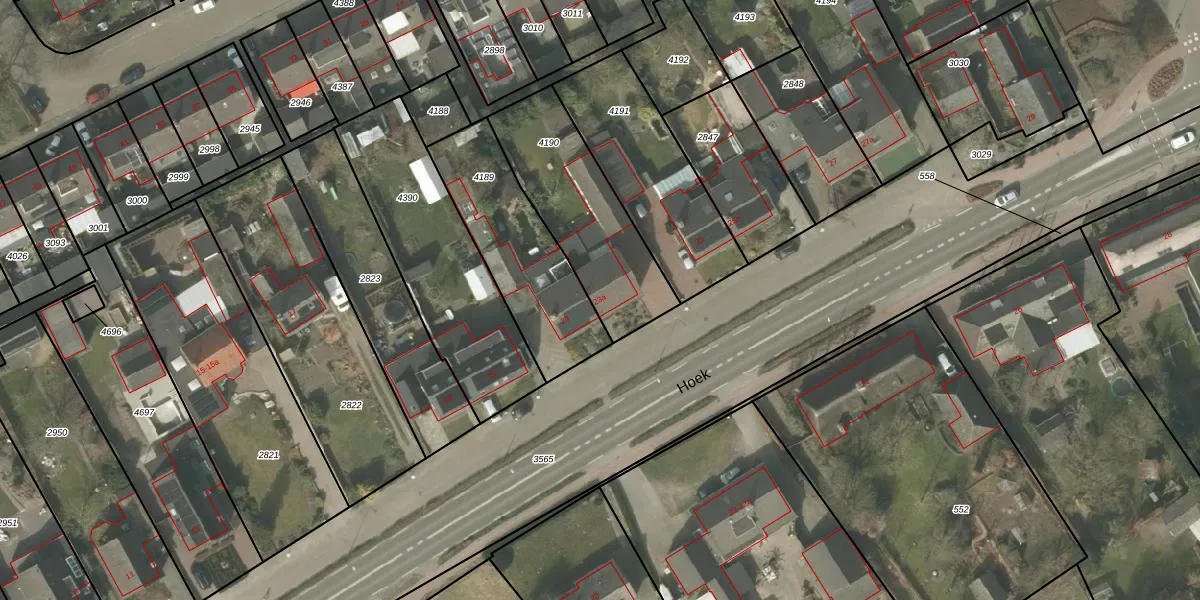 Het perceel waarop Hoek 23-a staat heeft een oppervlakte van 550 m². Dit is een groot perceel. De perceeloppervlakte wordt geregistreerd door het Kadaster. Gedetailleerde informatie over de maten van dit perceel kunt u vinden in het rapport Kadastrale kaart met maatvoering van Hoek 23-a.