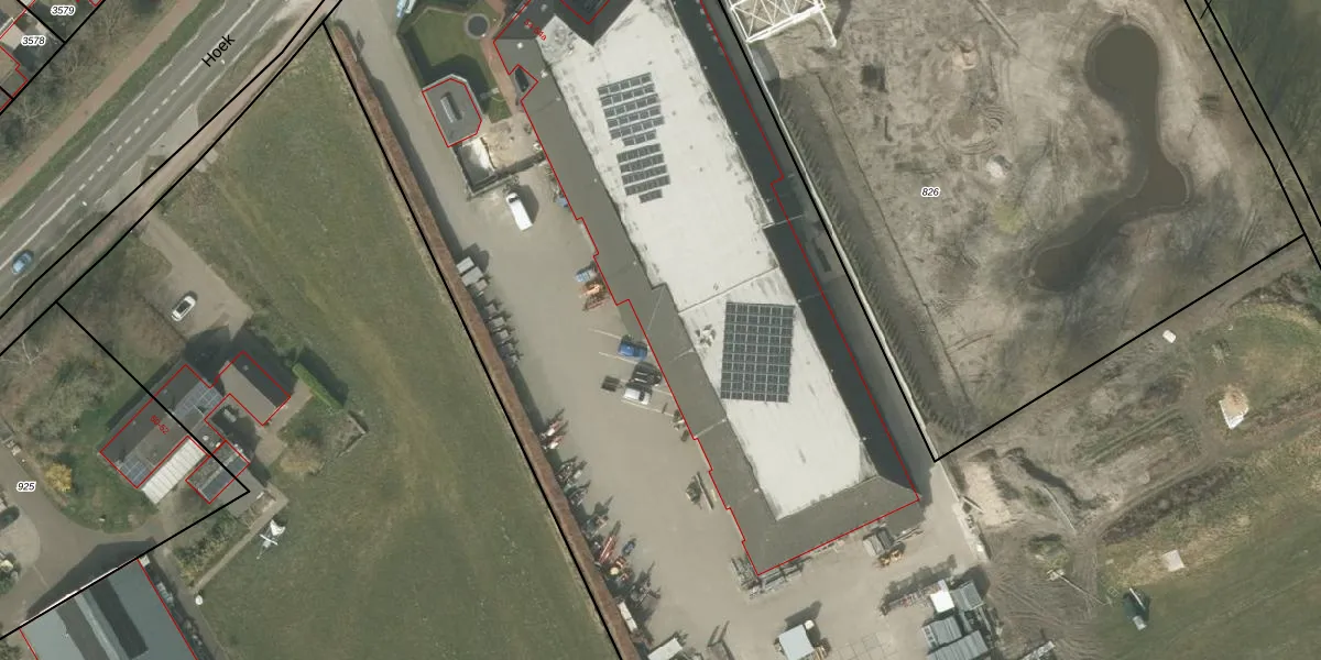 Het perceel waarop Hoek 54-a staat heeft een oppervlakte van 2,5 ha. Dit is een zeer groot perceel. De perceeloppervlakte wordt geregistreerd door het Kadaster. Gedetailleerde informatie over de maten van dit perceel kunt u vinden in het rapport Kadastrale kaart met maatvoering van Hoek 54-a.