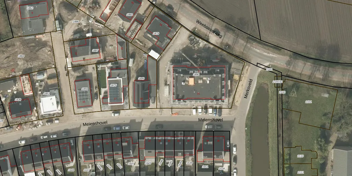 Het perceel waarop Meienshovel 21 staat heeft een oppervlakte van 1727 m². Dit is een zeer groot perceel. De perceeloppervlakte wordt geregistreerd door het Kadaster. Gedetailleerde informatie over de maten van dit perceel kunt u vinden in het rapport Kadastrale kaart met maatvoering van Meienshovel 21.