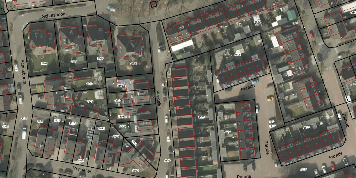 Het perceel waarop Vendelier 42 staat heeft een oppervlakte van 1840 m². Dit is een zeer groot perceel. De perceeloppervlakte wordt geregistreerd door het Kadaster. Gedetailleerde informatie over de maten van dit perceel kunt u vinden in het rapport Kadastrale kaart met maatvoering van Vendelier 42.