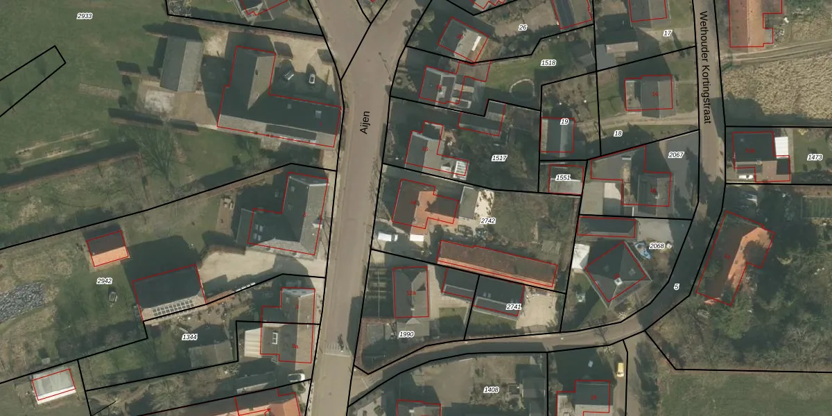 Het perceel waarop Aijen 14 staat heeft een oppervlakte van 1021 m². Dit is een zeer groot perceel. De perceeloppervlakte wordt geregistreerd door het Kadaster. Gedetailleerde informatie over de maten van dit perceel kunt u vinden in het rapport Kadastrale kaart met maatvoering van Aijen 14.