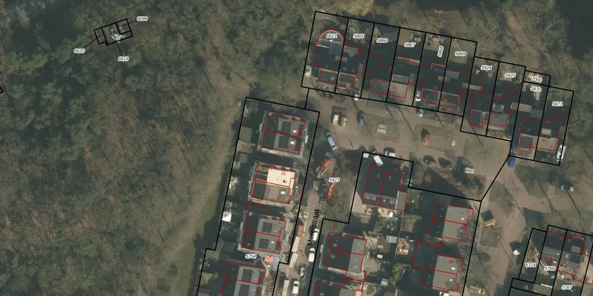 Het perceel waarop Merelstraat 21 staat heeft een oppervlakte van 2625 m². Dit is een zeer groot perceel. De perceeloppervlakte wordt geregistreerd door het Kadaster. Gedetailleerde informatie over de maten van dit perceel kunt u vinden in het rapport Kadastrale kaart met maatvoering van Merelstraat 21.