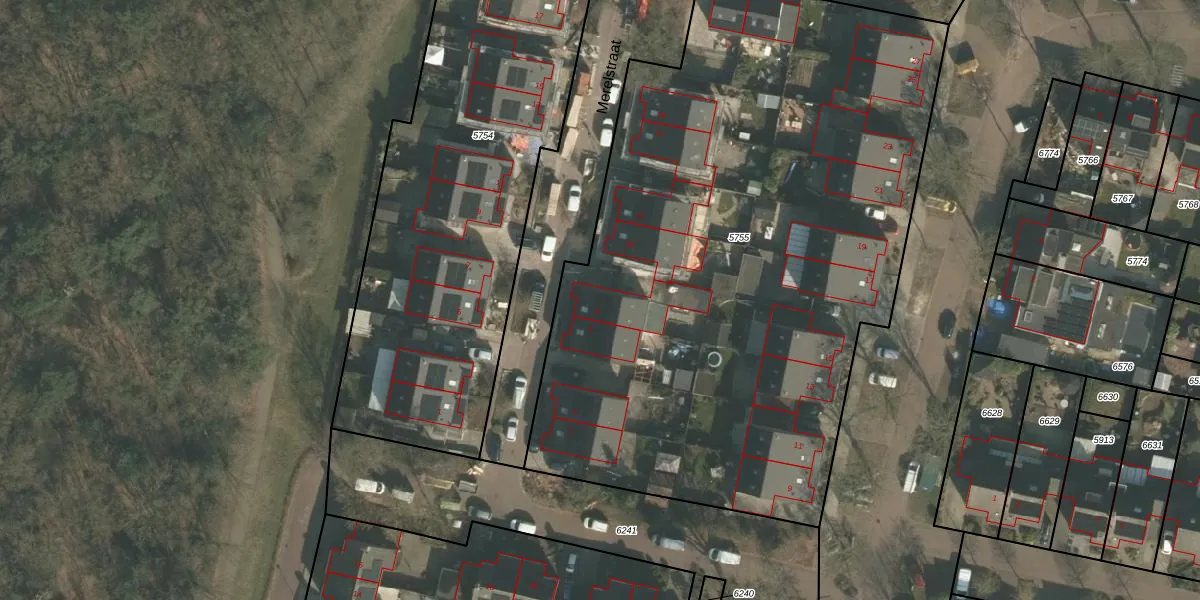Het perceel waarop Merelstraat 8 staat heeft een oppervlakte van 4360 m². Dit is een zeer groot perceel. De perceeloppervlakte wordt geregistreerd door het Kadaster. Gedetailleerde informatie over de maten van dit perceel kunt u vinden in het rapport Kadastrale kaart met maatvoering van Merelstraat 8.