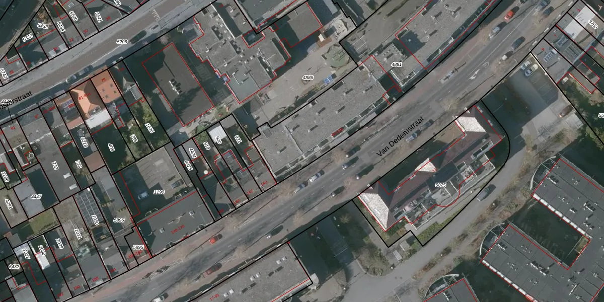 Het perceel waarop Van Dedemstraat 66 staat heeft een oppervlakte van 2220 m². Dit is een zeer groot perceel. De perceeloppervlakte wordt geregistreerd door het Kadaster. Gedetailleerde informatie over de maten van dit perceel kunt u vinden in het rapport Kadastrale kaart met maatvoering van Van Dedemstraat 66.