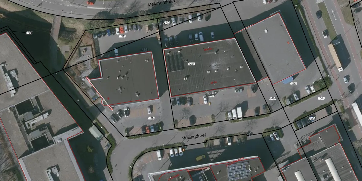 Het perceel waarop Veilingdreef 18 staat heeft een oppervlakte van 2665 m². Dit is een zeer groot perceel. De perceeloppervlakte wordt geregistreerd door het Kadaster. Gedetailleerde informatie over de maten van dit perceel kunt u vinden in het rapport Kadastrale kaart met maatvoering van Veilingdreef 18.