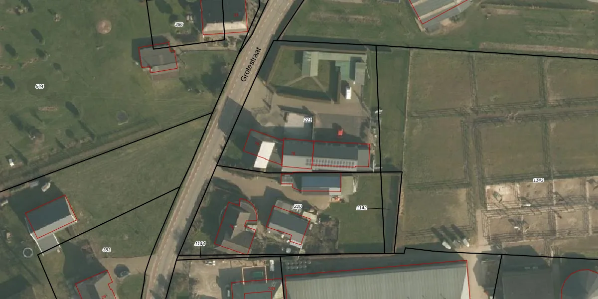Het perceel waarop Grotestraat 78 staat heeft een oppervlakte van 1940 m². Dit is een zeer groot perceel. De perceeloppervlakte wordt geregistreerd door het Kadaster. Gedetailleerde informatie over de maten van dit perceel kunt u vinden in het rapport Kadastrale kaart met maatvoering van Grotestraat 78.