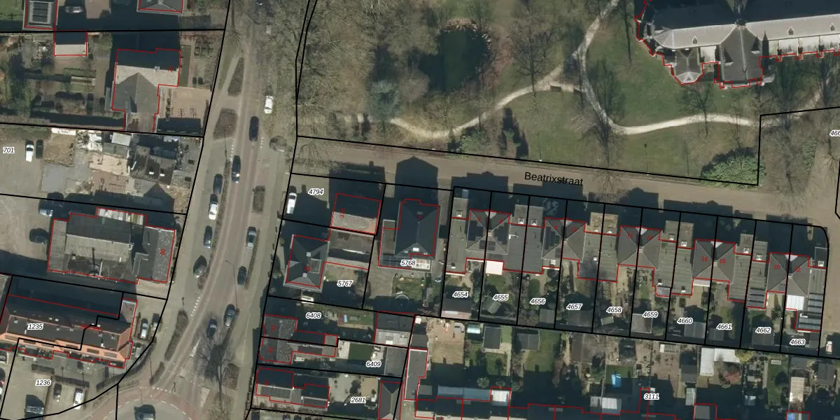 Het perceel waarop Beatrixstraat 2 staat heeft een oppervlakte van 535 m². Dit is een groot perceel. De perceeloppervlakte wordt geregistreerd door het Kadaster. Gedetailleerde informatie over de maten van dit perceel kunt u vinden in het rapport Kadastrale kaart met maatvoering van Beatrixstraat 2.