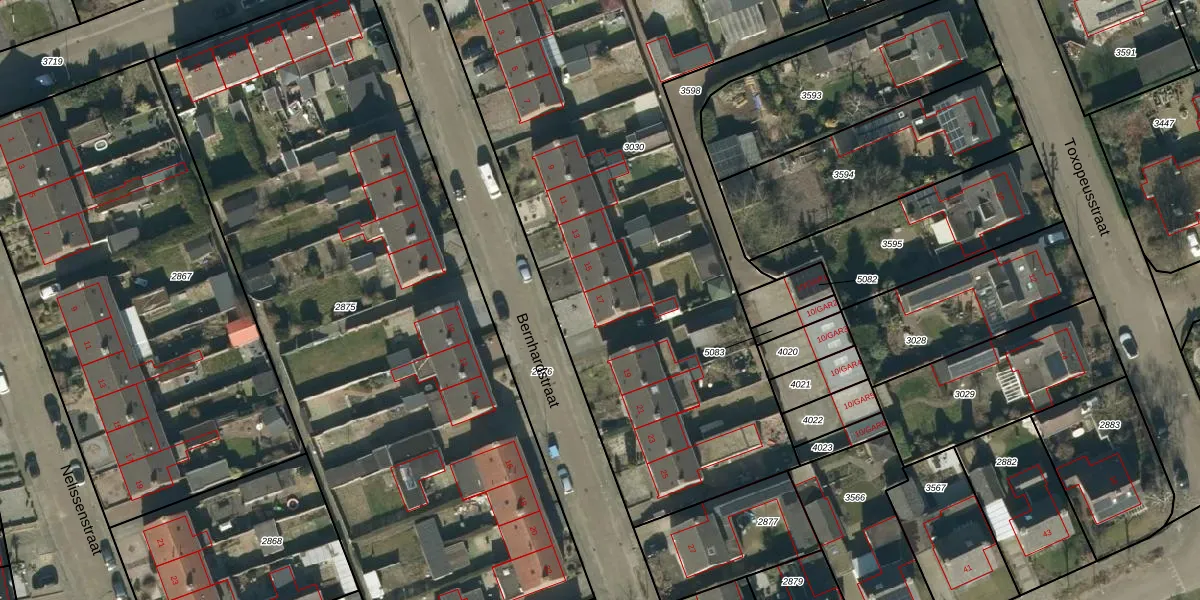 Het perceel waarop Bernhardstraat 17 staat heeft een oppervlakte van 3970 m². Dit is een zeer groot perceel. De perceeloppervlakte wordt geregistreerd door het Kadaster. Gedetailleerde informatie over de maten van dit perceel kunt u vinden in het rapport Kadastrale kaart met maatvoering van Bernhardstraat 17.