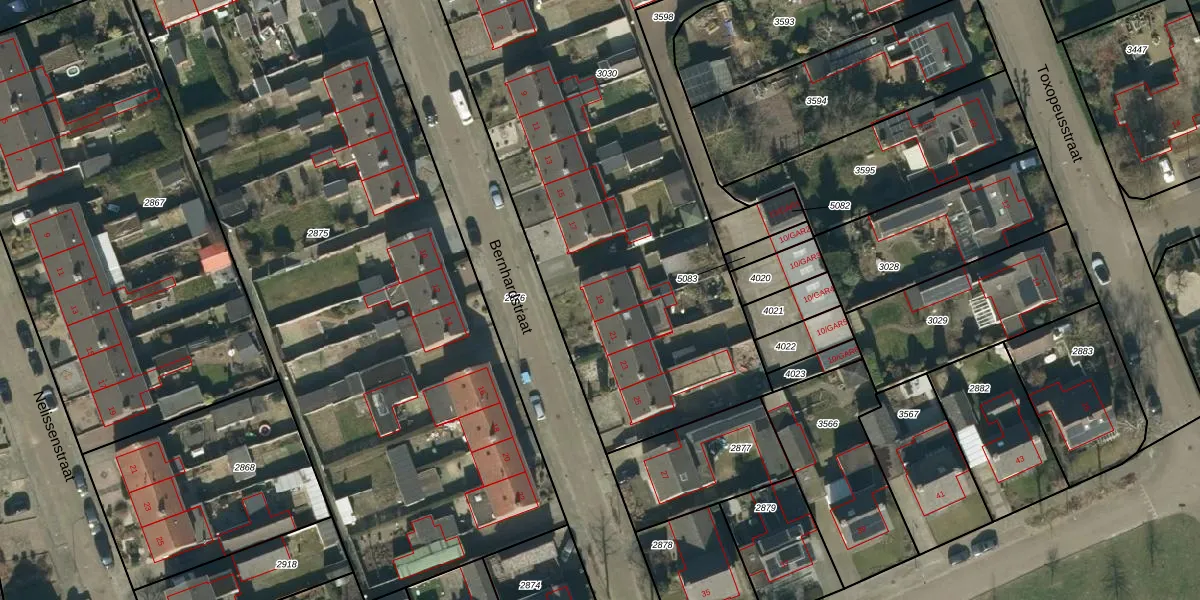 Het perceel waarop Bernhardstraat 19 staat heeft een oppervlakte van 3970 m². Dit is een zeer groot perceel. De perceeloppervlakte wordt geregistreerd door het Kadaster. Gedetailleerde informatie over de maten van dit perceel kunt u vinden in het rapport Kadastrale kaart met maatvoering van Bernhardstraat 19.