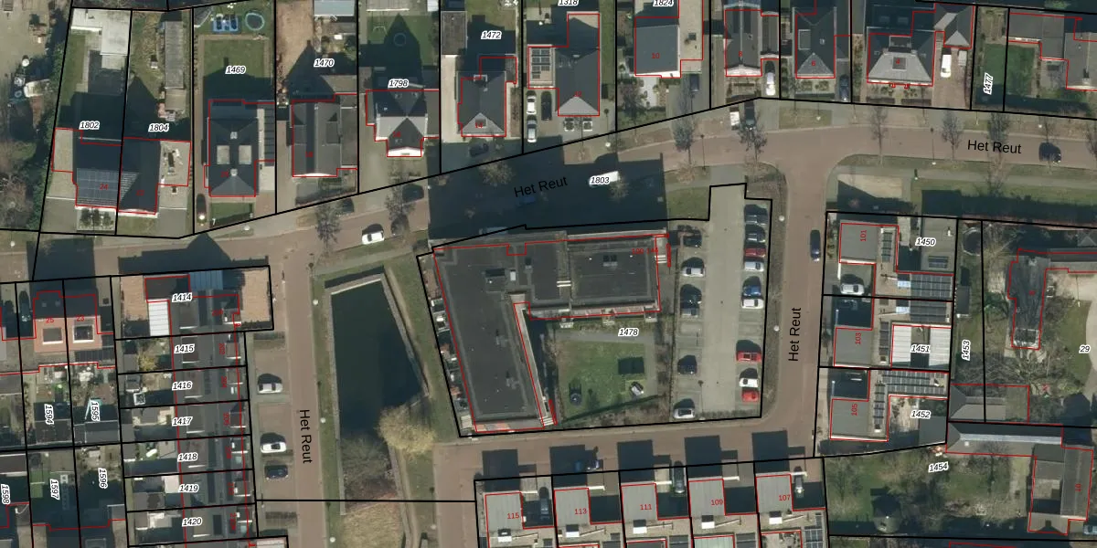 Het perceel waarop Het Reut 130 staat heeft een oppervlakte van 2255 m². Dit is een zeer groot perceel. De perceeloppervlakte wordt geregistreerd door het Kadaster. Gedetailleerde informatie over de maten van dit perceel kunt u vinden in het rapport Kadastrale kaart met maatvoering van Het Reut 130.