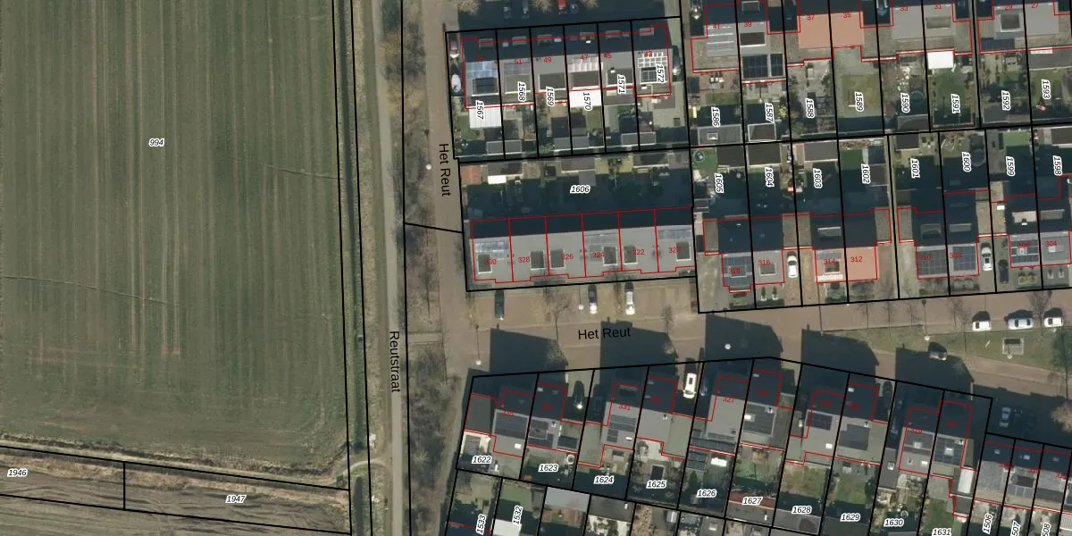 Het perceel waarop Het Reut 328 staat heeft een oppervlakte van 1037 m². Dit is een zeer groot perceel. De perceeloppervlakte wordt geregistreerd door het Kadaster. Gedetailleerde informatie over de maten van dit perceel kunt u vinden in het rapport Kadastrale kaart met maatvoering van Het Reut 328.