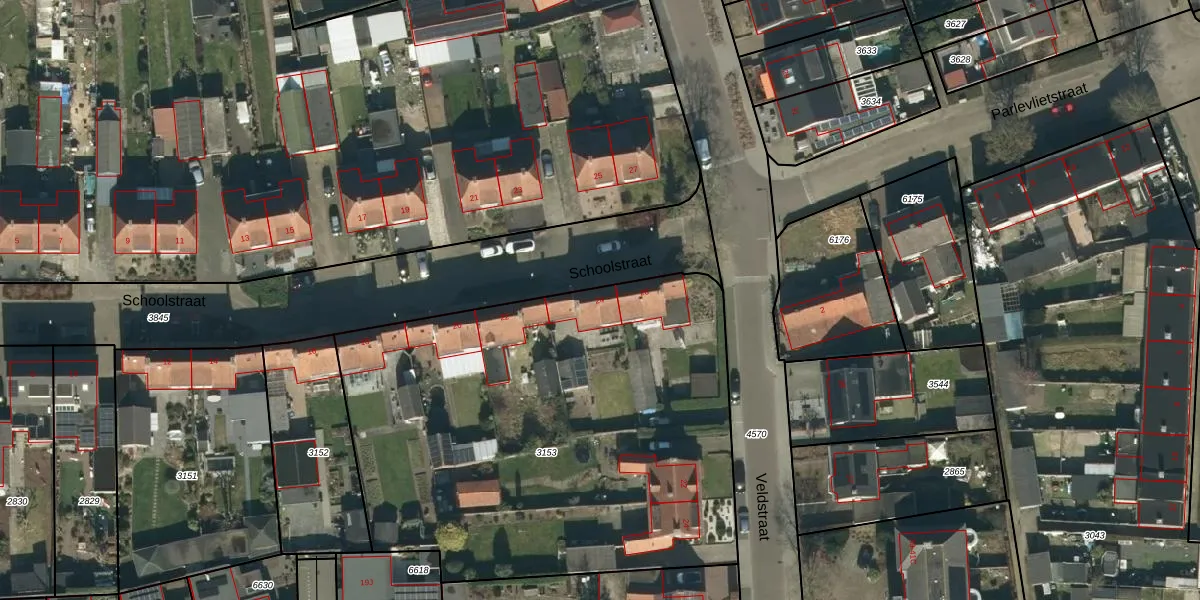 Het perceel waarop Schoolstraat 24 staat heeft een oppervlakte van 2836 m². Dit is een zeer groot perceel. De perceeloppervlakte wordt geregistreerd door het Kadaster. Gedetailleerde informatie over de maten van dit perceel kunt u vinden in het rapport Kadastrale kaart met maatvoering van Schoolstraat 24.