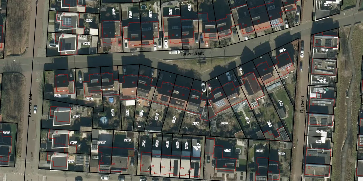 Het perceel waarop Tarwestraat 32 staat heeft een oppervlakte van 310 m². Dit is een groot perceel. De perceeloppervlakte wordt geregistreerd door het Kadaster. Gedetailleerde informatie over de maten van dit perceel kunt u vinden in het rapport Kadastrale kaart met maatvoering van Tarwestraat 32.