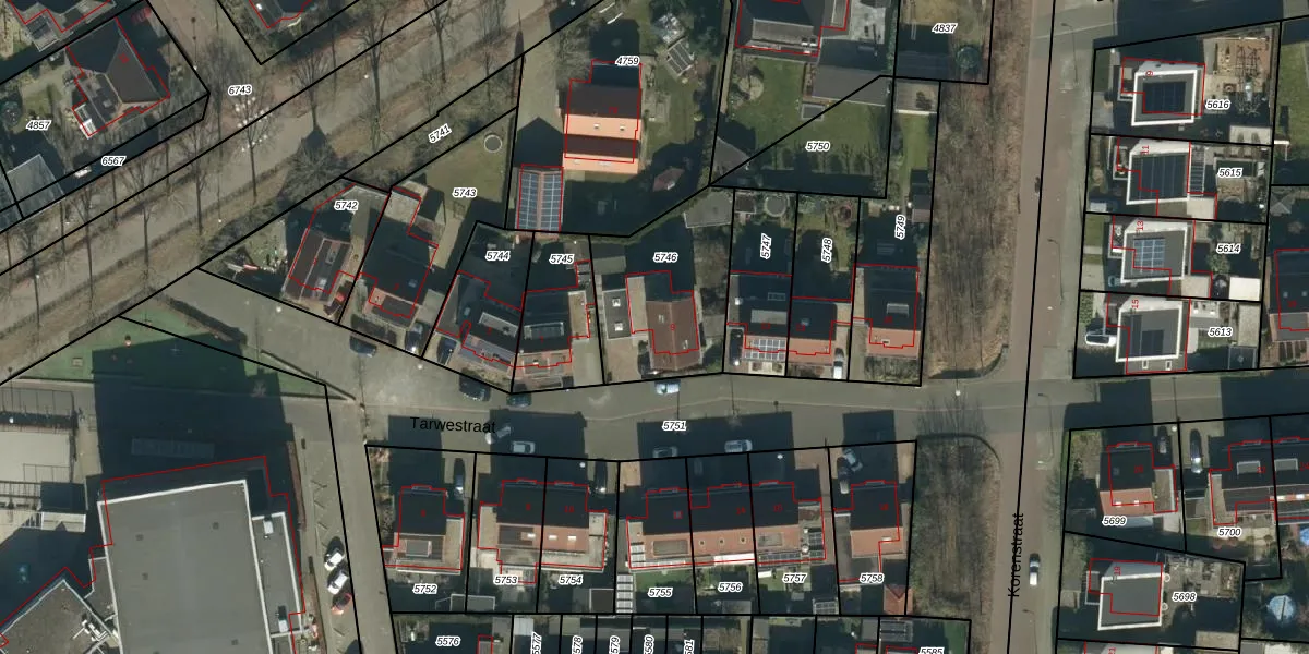 Het perceel waarop Tarwestraat 9 staat heeft een oppervlakte van 507 m². Dit is een groot perceel. De perceeloppervlakte wordt geregistreerd door het Kadaster. Gedetailleerde informatie over de maten van dit perceel kunt u vinden in het rapport Kadastrale kaart met maatvoering van Tarwestraat 9.