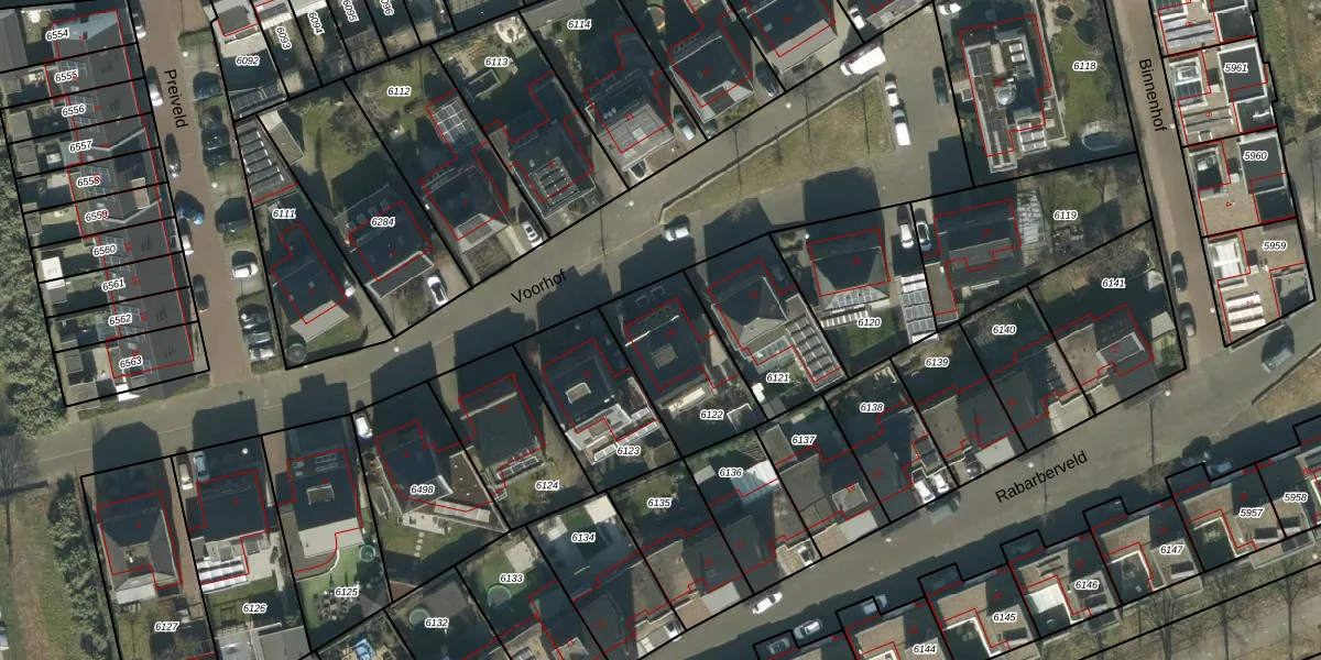 Het perceel waarop Voorhof 14 staat heeft een oppervlakte van 369 m². Dit is een groot perceel. De perceeloppervlakte wordt geregistreerd door het Kadaster. Gedetailleerde informatie over de maten van dit perceel kunt u vinden in het rapport Kadastrale kaart met maatvoering van Voorhof 14.