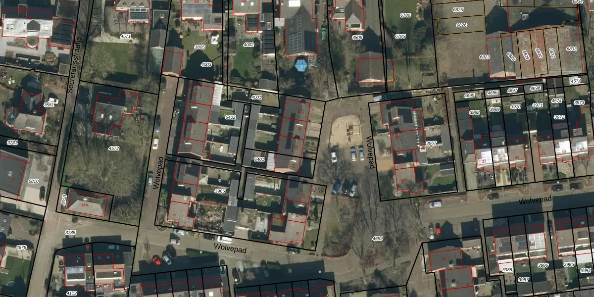 Het perceel waarop Wolvepad 23 staat heeft een oppervlakte van 1033 m². Dit is een zeer groot perceel. De perceeloppervlakte wordt geregistreerd door het Kadaster. Gedetailleerde informatie over de maten van dit perceel kunt u vinden in het rapport Kadastrale kaart met maatvoering van Wolvepad 23.