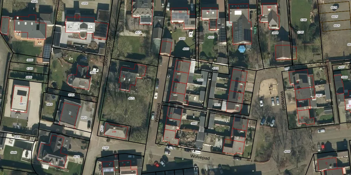 Het perceel waarop Wolvepad 9 staat heeft een oppervlakte van 1033 m². Dit is een zeer groot perceel. De perceeloppervlakte wordt geregistreerd door het Kadaster. Gedetailleerde informatie over de maten van dit perceel kunt u vinden in het rapport Kadastrale kaart met maatvoering van Wolvepad 9.