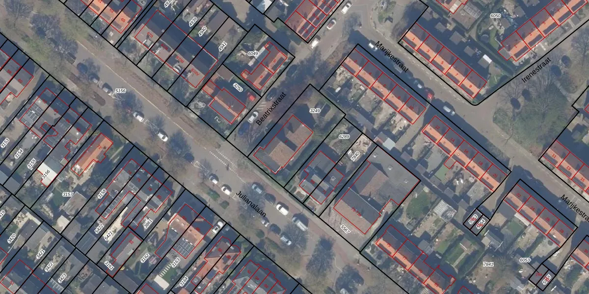 Het perceel waarop Beatrixstraat 2 staat heeft een oppervlakte van 527 m². Dit is een groot perceel. De perceeloppervlakte wordt geregistreerd door het Kadaster. Gedetailleerde informatie over de maten van dit perceel kunt u vinden in het rapport Kadastrale kaart met maatvoering van Beatrixstraat 2.