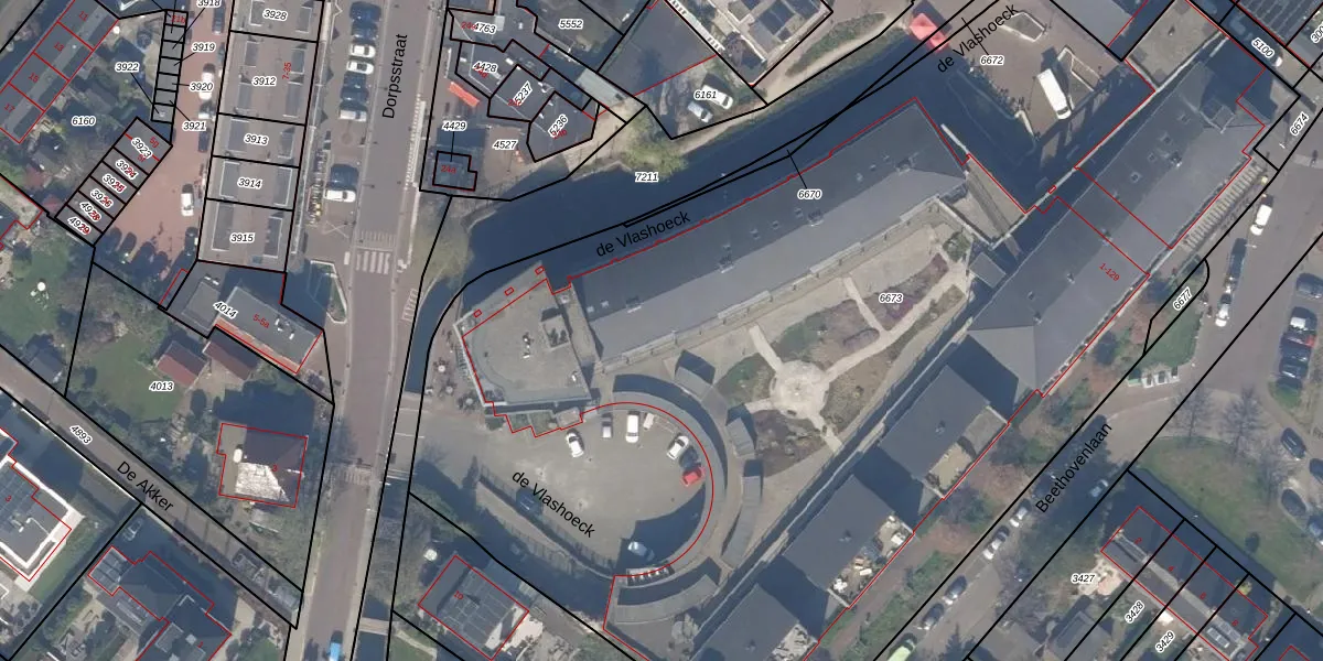 Het perceel waarop de Vlashoeck 121 staat heeft een oppervlakte van 8105 m². Dit is een zeer groot perceel. De perceeloppervlakte wordt geregistreerd door het Kadaster. Gedetailleerde informatie over de maten van dit perceel kunt u vinden in het rapport Kadastrale kaart met maatvoering van de Vlashoeck 121.