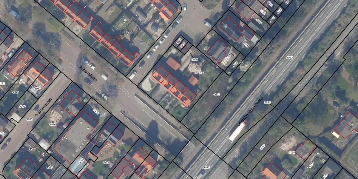 Het perceel waarop Julianalaan 111 staat heeft een oppervlakte van 1095 m². Dit is een zeer groot perceel. De perceeloppervlakte wordt geregistreerd door het Kadaster. Gedetailleerde informatie over de maten van dit perceel kunt u vinden in het rapport Kadastrale kaart met maatvoering van Julianalaan 111.
