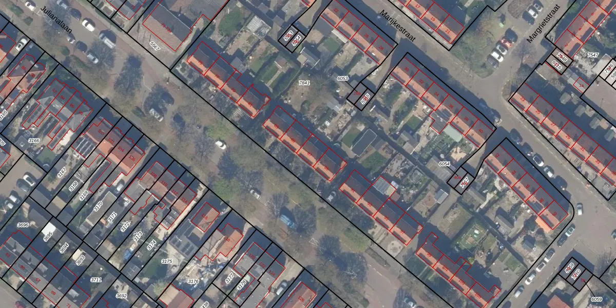 Het perceel waarop Julianalaan 87 staat heeft een oppervlakte van 7611 m². Dit is een zeer groot perceel. De perceeloppervlakte wordt geregistreerd door het Kadaster. Gedetailleerde informatie over de maten van dit perceel kunt u vinden in het rapport Kadastrale kaart met maatvoering van Julianalaan 87.