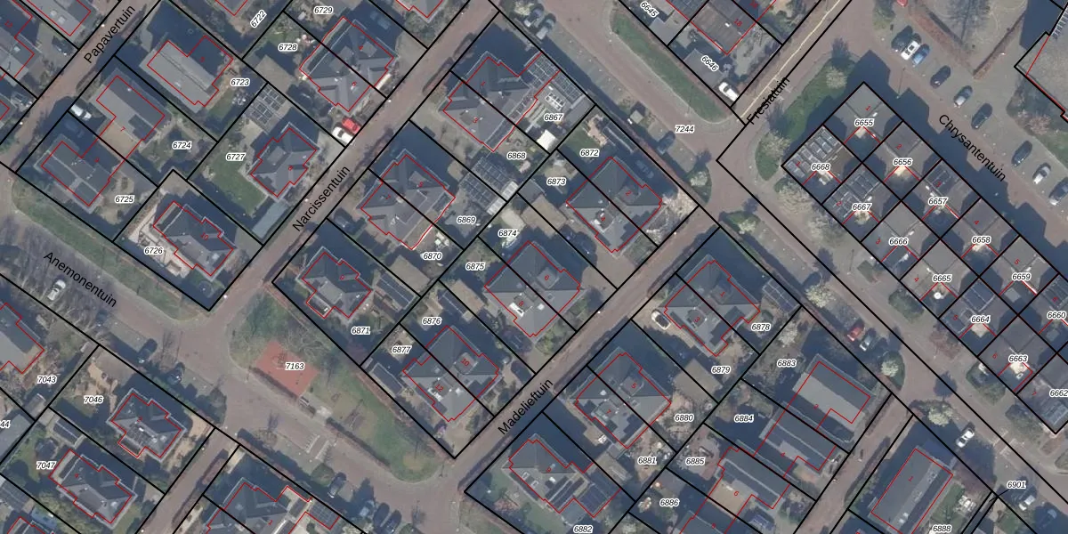 Het perceel waarop Madelieftuin 6 staat heeft een oppervlakte van 287 m². Dit is een middelgroot perceel. De perceeloppervlakte wordt geregistreerd door het Kadaster. Gedetailleerde informatie over de maten van dit perceel kunt u vinden in het rapport Kadastrale kaart met maatvoering van Madelieftuin 6.