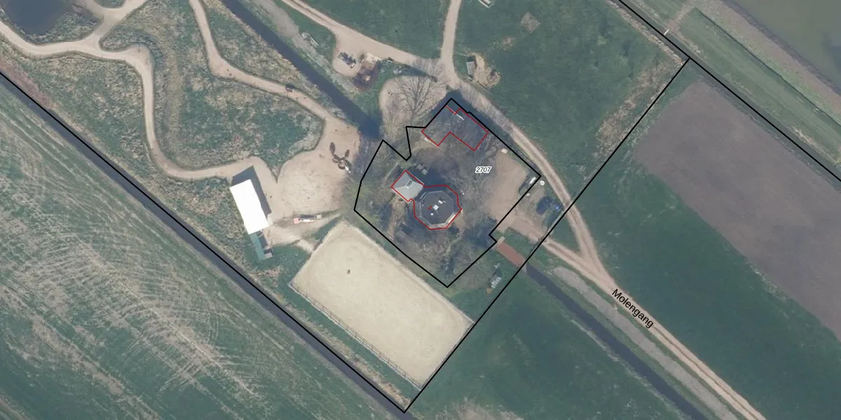 Het perceel waarop Molengang 2 staat heeft een oppervlakte van 1080 m². Dit is een zeer groot perceel. De perceeloppervlakte wordt geregistreerd door het Kadaster. Gedetailleerde informatie over de maten van dit perceel kunt u vinden in het rapport Kadastrale kaart met maatvoering van Molengang 2.