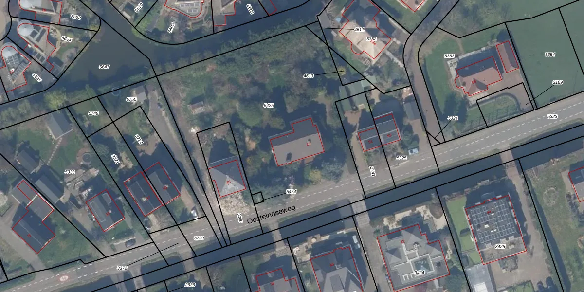 Het perceel waarop Oosteindseweg 47 staat heeft een oppervlakte van 2973 m². Dit is een zeer groot perceel. De perceeloppervlakte wordt geregistreerd door het Kadaster. Gedetailleerde informatie over de maten van dit perceel kunt u vinden in het rapport Kadastrale kaart met maatvoering van Oosteindseweg 47.