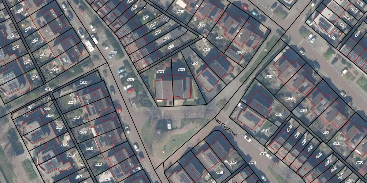 Het perceel waarop van Goghlaan 3 staat heeft een oppervlakte van 346 m². Dit is een groot perceel. De perceeloppervlakte wordt geregistreerd door het Kadaster. Gedetailleerde informatie over de maten van dit perceel kunt u vinden in het rapport Kadastrale kaart met maatvoering van van Goghlaan 3.