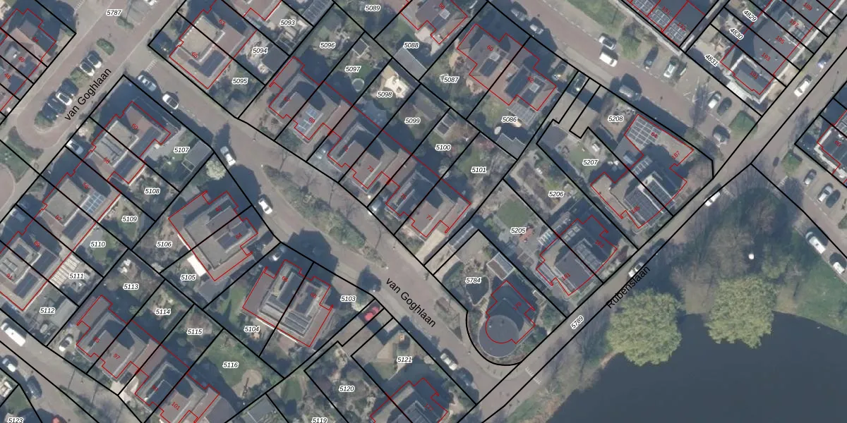 Het perceel waarop van Goghlaan 77 staat heeft een oppervlakte van 360 m². Dit is een groot perceel. De perceeloppervlakte wordt geregistreerd door het Kadaster. Gedetailleerde informatie over de maten van dit perceel kunt u vinden in het rapport Kadastrale kaart met maatvoering van van Goghlaan 77.