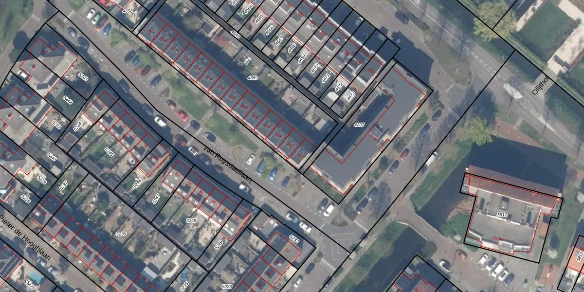 Het perceel waarop van Ruysdaellaan 191 staat heeft een oppervlakte van 1538 m². Dit is een zeer groot perceel. De perceeloppervlakte wordt geregistreerd door het Kadaster. Gedetailleerde informatie over de maten van dit perceel kunt u vinden in het rapport Kadastrale kaart met maatvoering van van Ruysdaellaan 191.
