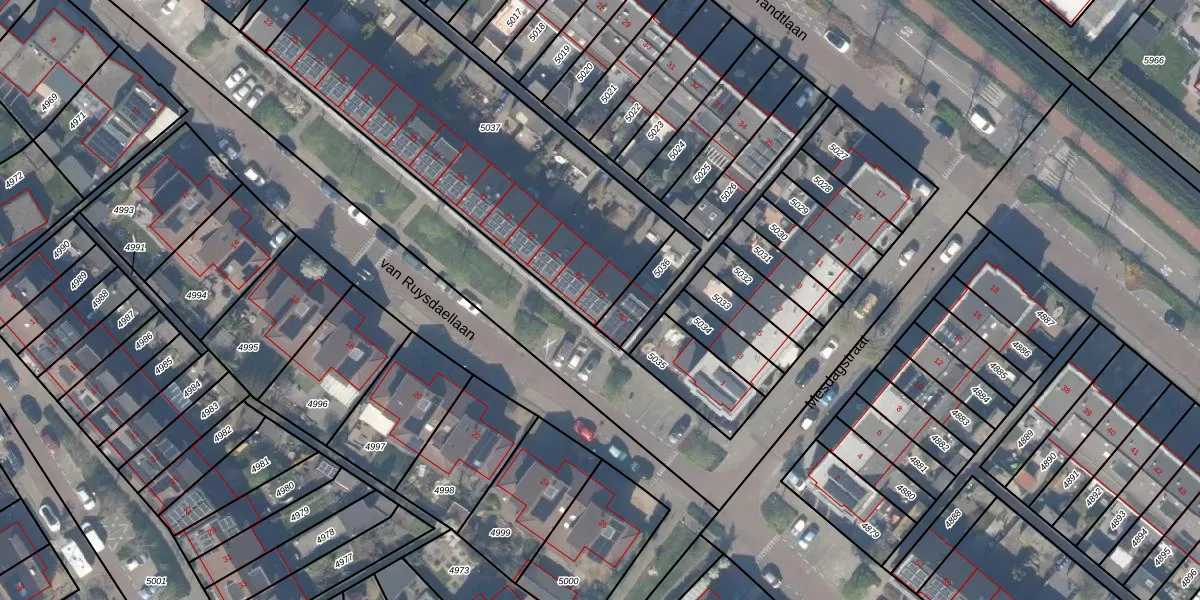 Het perceel waarop van Ruysdaellaan 51 staat heeft een oppervlakte van 1512 m². Dit is een zeer groot perceel. De perceeloppervlakte wordt geregistreerd door het Kadaster. Gedetailleerde informatie over de maten van dit perceel kunt u vinden in het rapport Kadastrale kaart met maatvoering van van Ruysdaellaan 51.