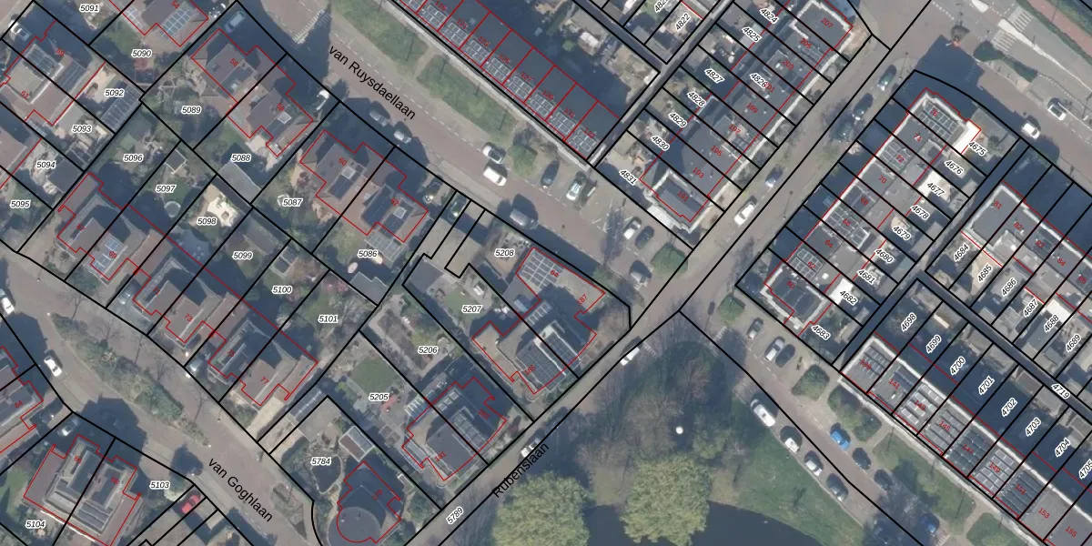Het perceel waarop van Ruysdaellaan 64 staat heeft een oppervlakte van 440 m². Dit is een groot perceel. De perceeloppervlakte wordt geregistreerd door het Kadaster. Gedetailleerde informatie over de maten van dit perceel kunt u vinden in het rapport Kadastrale kaart met maatvoering van van Ruysdaellaan 64.