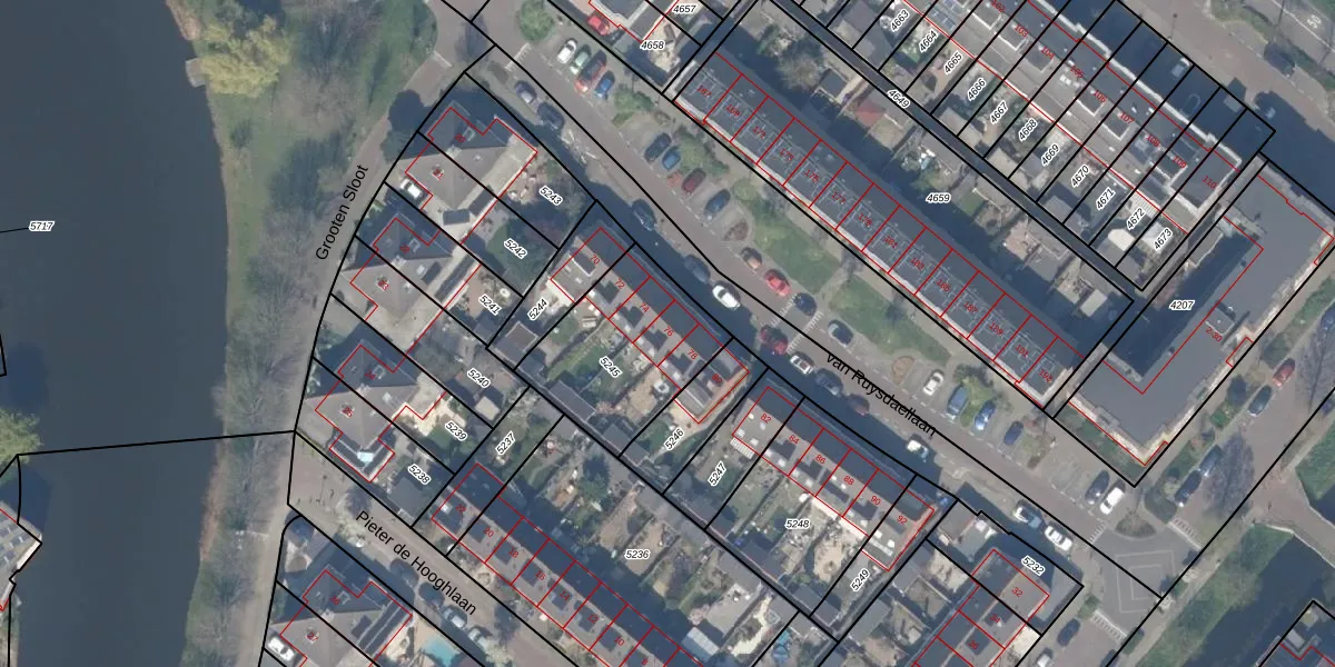 Het perceel waarop van Ruysdaellaan 76 staat heeft een oppervlakte van 524 m². Dit is een groot perceel. De perceeloppervlakte wordt geregistreerd door het Kadaster. Gedetailleerde informatie over de maten van dit perceel kunt u vinden in het rapport Kadastrale kaart met maatvoering van van Ruysdaellaan 76.